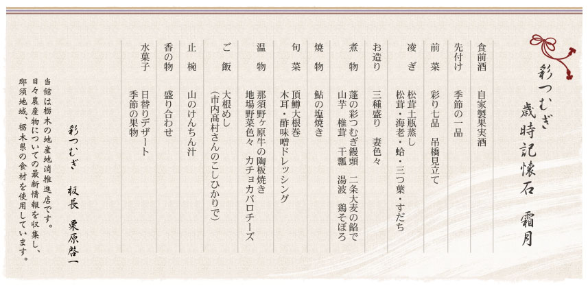 栃木の幸をふんだんに盛り込んだお料理と共に 味わっていただきたい、栃木の地酒。 当館厳選の、美味しいお酒を揃えております。 自家製の果実酒に加え、旅の思い出にそれぞれ特徴のある 美味しい地酒をぜひ飲み比べてみてください。